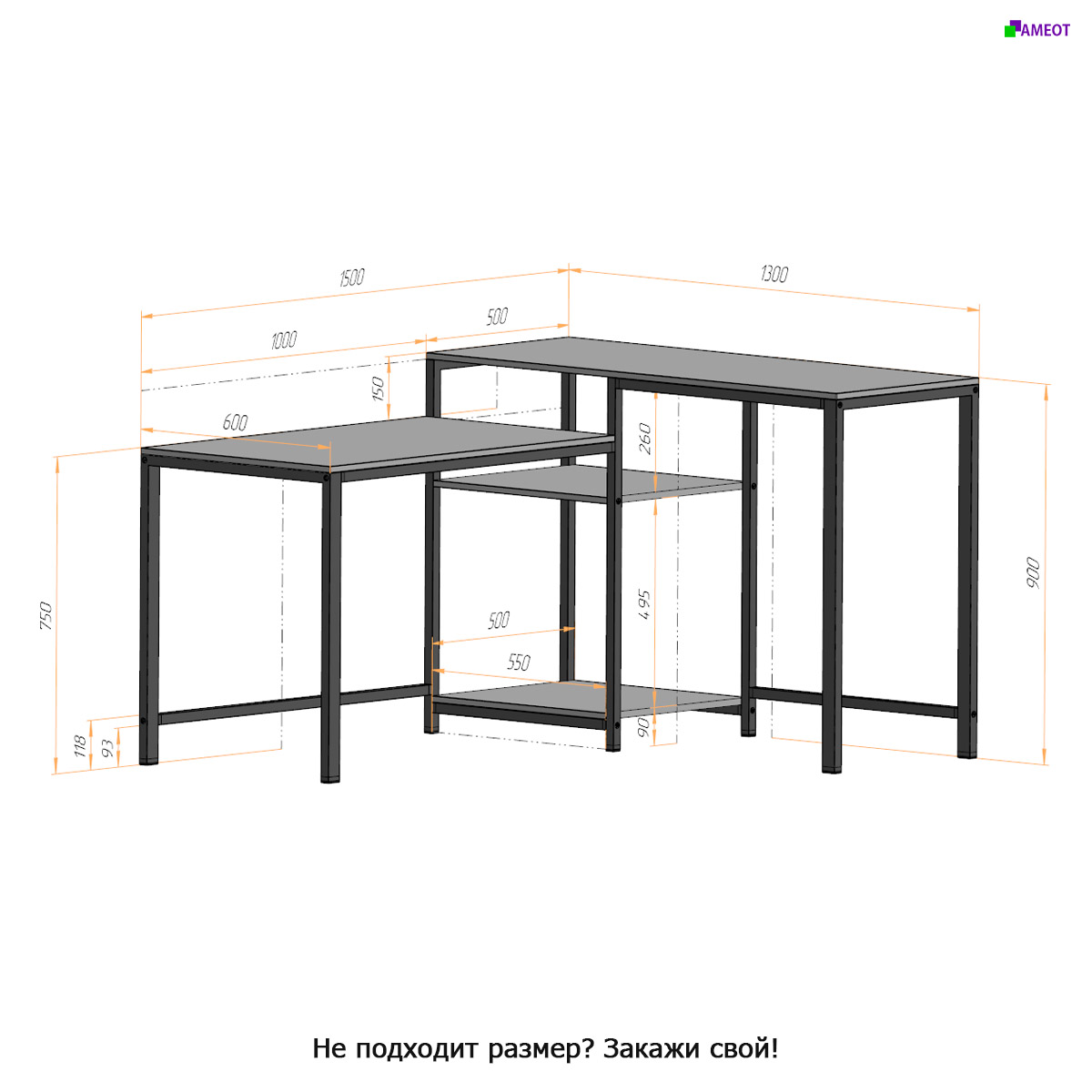 - Вторая столешница более высокая, будет удобна для установки оргтехники или работы стоя.