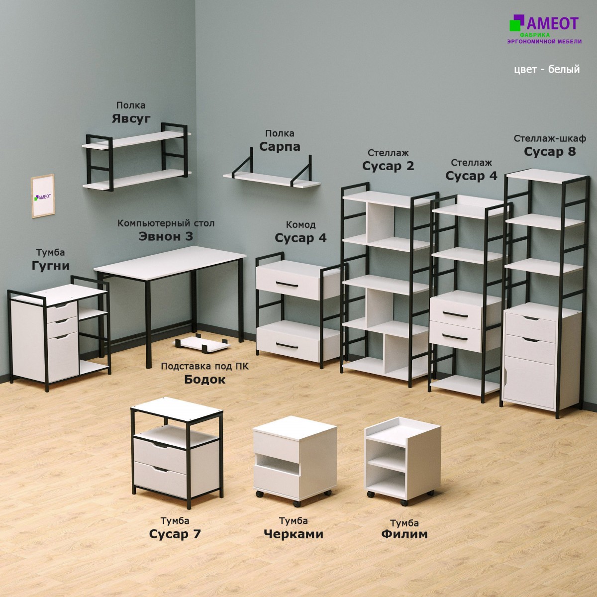 Складские позиции стола Эвнон 3: ширина (длина) 86, 104, 120 и 138 см, глубина 52, 60 и 70 см, цвет каркаса: черный, цвет столешницы: белый, сосна битон белый и таксония.