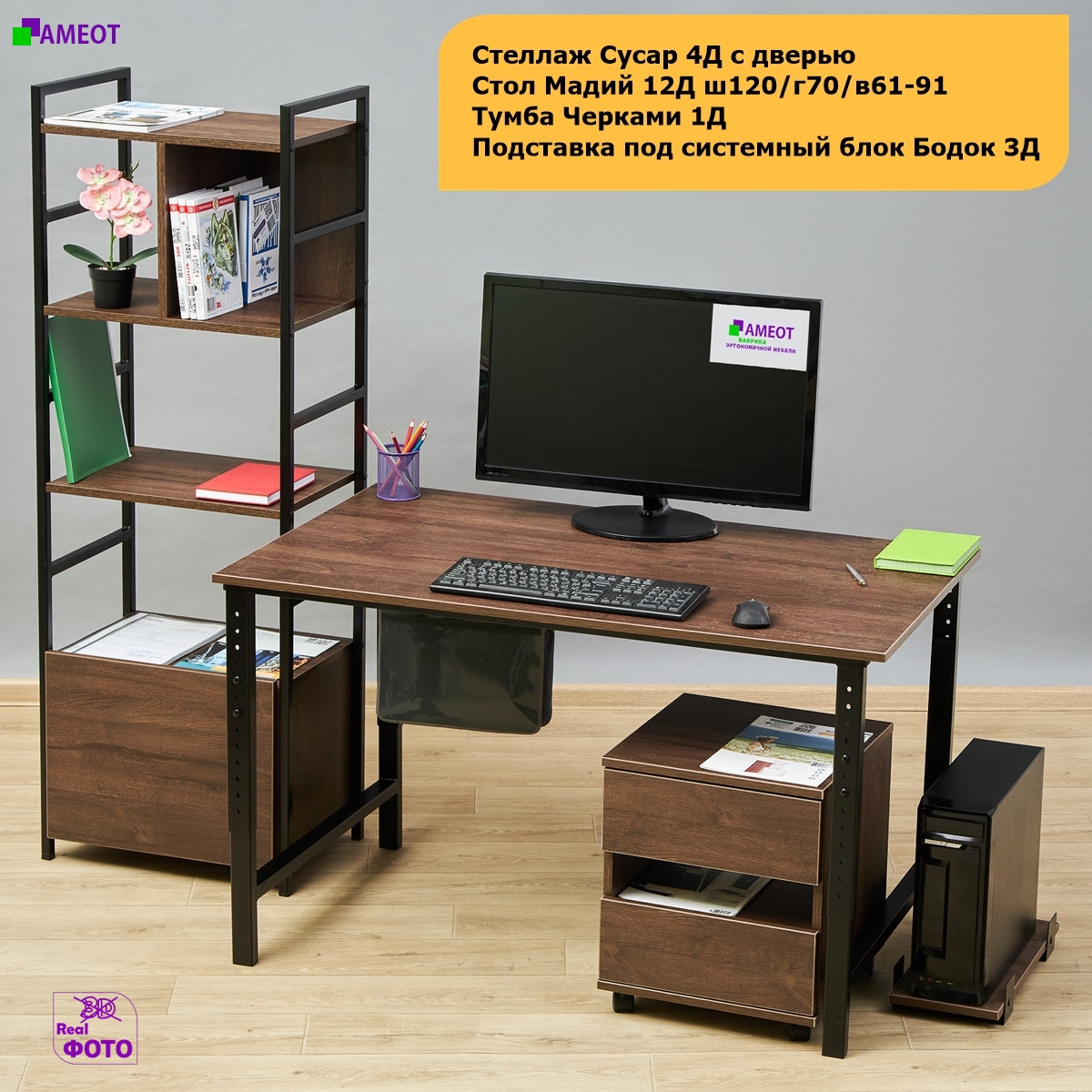 Регулируемый по высоте стол Мадий 12, стеллаж Сусар 4 с дверью, тумба Черками 1, подставка под системный блок Бодок 3.
